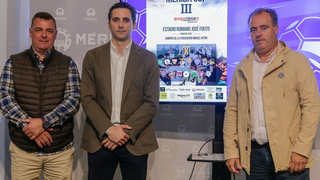 El delegado de Deportes, Toni Marín, acompañado por el director general del Mérida AD, Alejandro Pérez, y el director de la Academia AD Mérida, Luis Miguel Olivar, ha presentado el torneo.