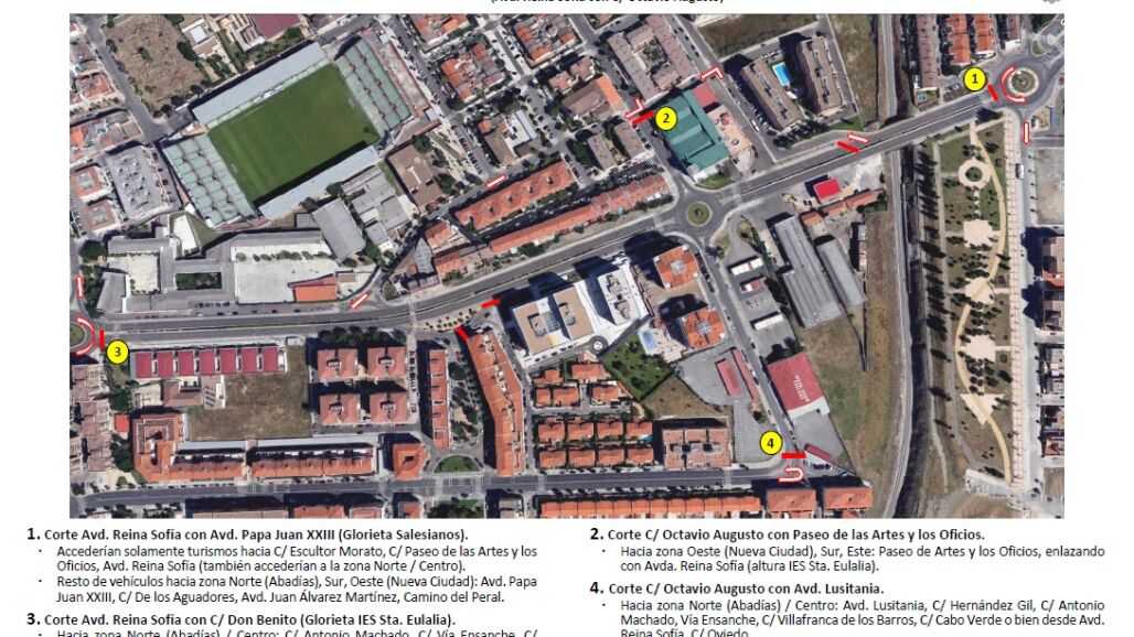 Para acceder a la Zona Oeste y Centro se desviarán por Avenida Juan Carlos I, Avenida de Extremadura y Avenida José María Álvarez Martínez y, para acceder a la Zona Norte, por Avenida Felipe VI, Avenida Vía de la Plata y Ronda de los Eméritos.