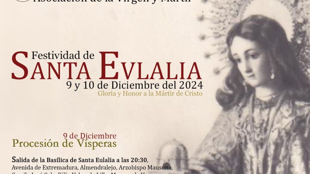 El vocal de manifestaciones públicas de la Asociación de la Virgen y Mártir Santa Eulalia, Carlos López, ha dado a conocer los actos religiosos que comenzarán en la Basílica el 6 de diciembre, a las 12 horas, con el pregón a Santa Eulalia a cargo del Arzobispo de Mérida-Badajoz, Fray José Rodríguez Carballo y ene l que intervendrá el Coro Manuel Domínguez.