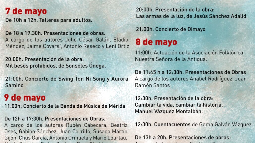 “En la feria habrá actuaciones musicales nocturnas todos los días, presentaciones de libros para todos los públicos y también actividades y talleres dirigidas al público adulto e infantil. Contará con más casetas y espacio para las librerías, así como también más amplitud para los espacios infantiles y sus actividades”.