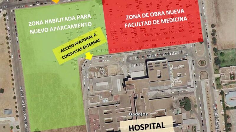 La Junta firmará el Jueves el acta de replanteo y, se procederá a vallar la zona que actualmente ocupan los actuales aparcamientos de las traseras del Hospital Universitario de Badajoz, lo cual provocará cambios en el aparcamiento y en los accesos al Hospital Universitario.