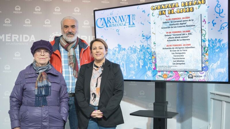 Este ciclo de mesas redondas han sido presentado este lunes por la delegada de Festejos, Ana Aragoneses, junto con la presidenta del Liceo de Mérida, Tenti Martínez, y el presidente de la Asociación Cultural Carnaval Romano, Andrés Madrigal.