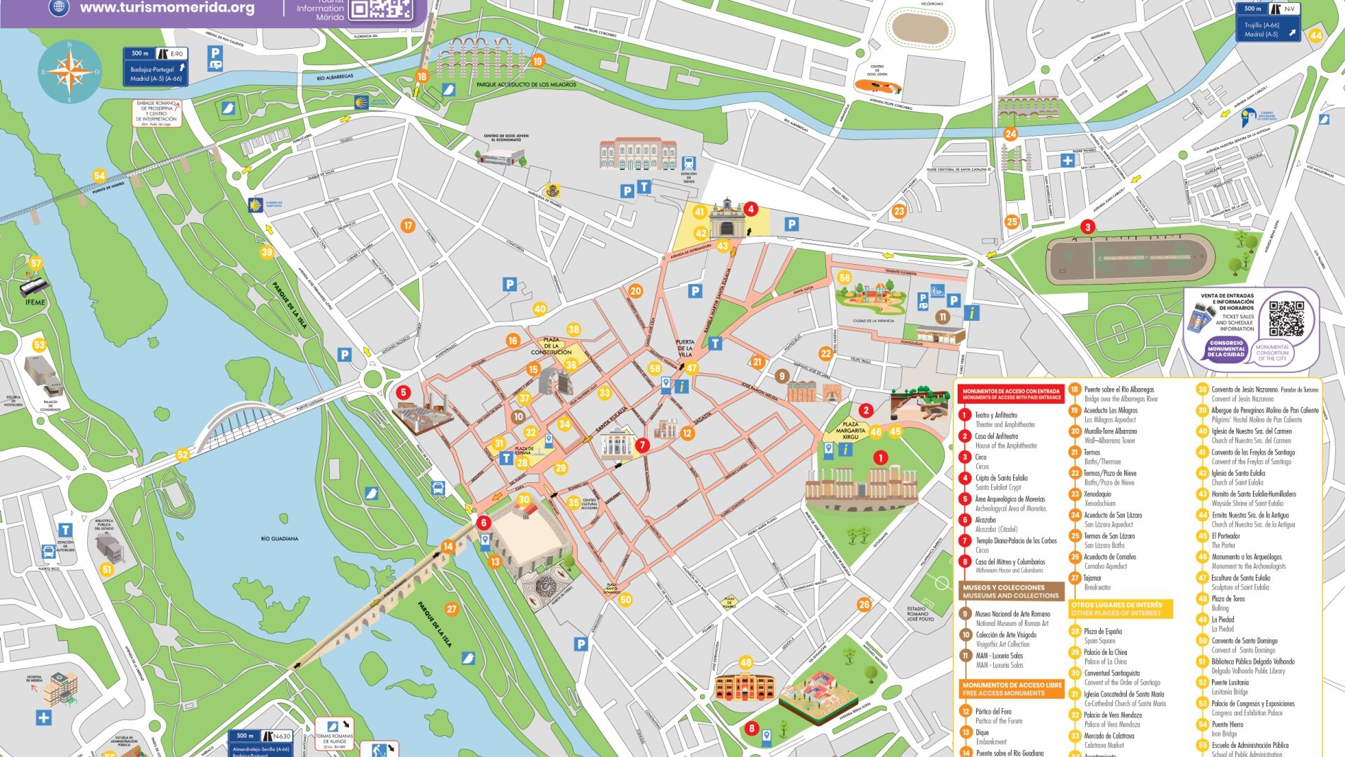 Así mismo recoge un apartado con los horarios de los monumentos tanto de verano como de invierno y el enlace para adquirir las entradas a la Web del Consorcio de la Ciudad de Mérida, así como el mapa de situación y los teléfonos Por otra parte, el plano cuenta con un apartado exclusivo llamado “Mérida