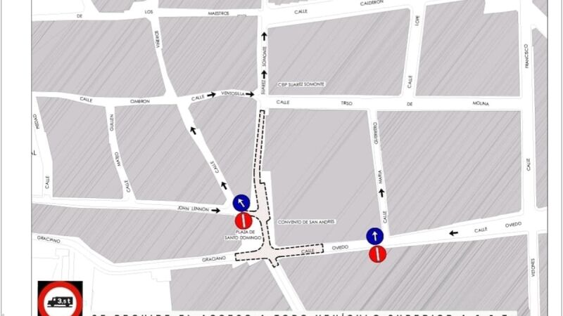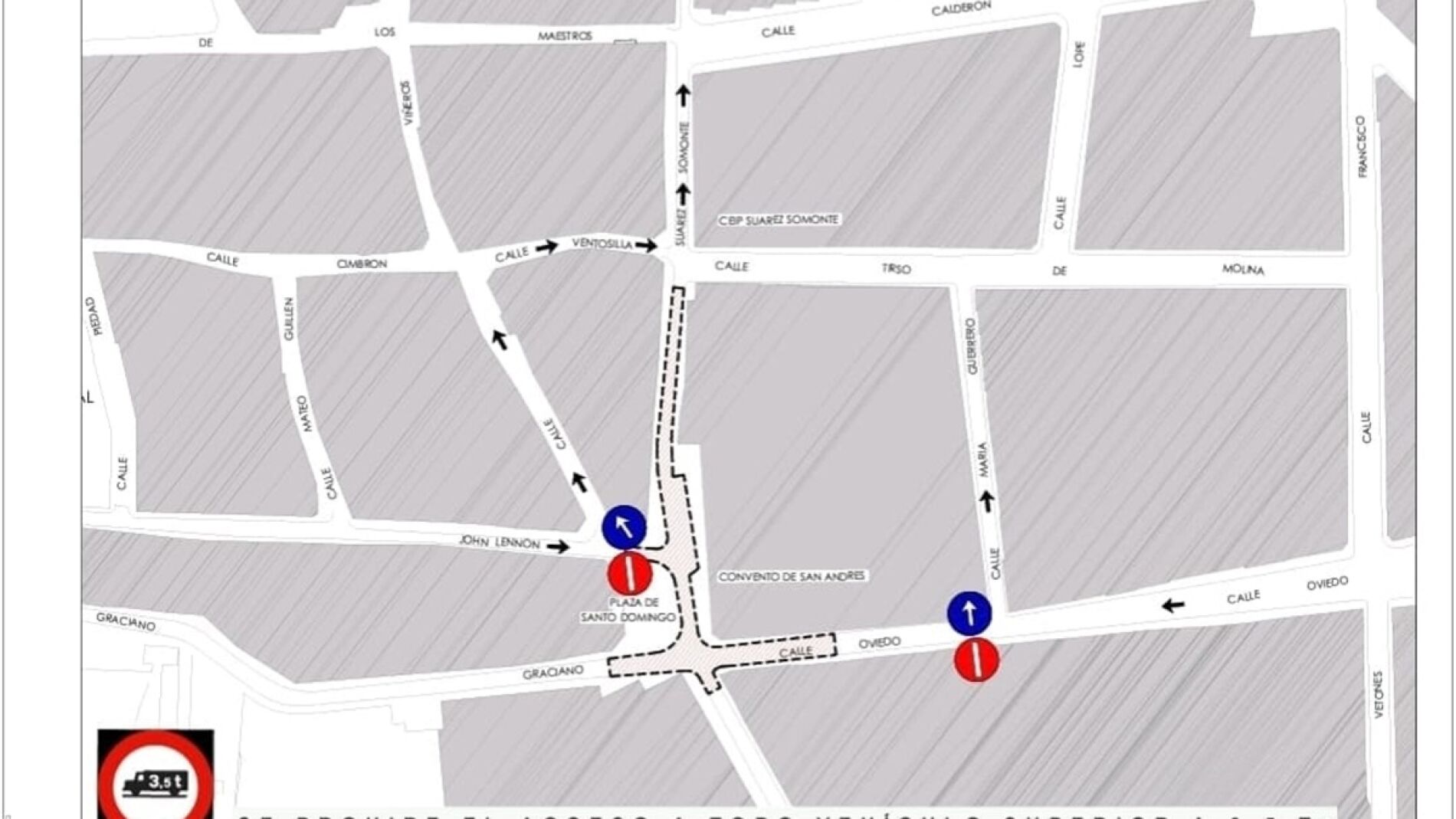 Se prohíbe el acceso a este itinerario a los vehículos pesados, de más de 3,5 toneladas, y autobuses. Las paradas de autobús urbano de la Plaza Santo Domingo y Plaza de Toros quedan inutilizadas hasta la finalización de esta actuación.