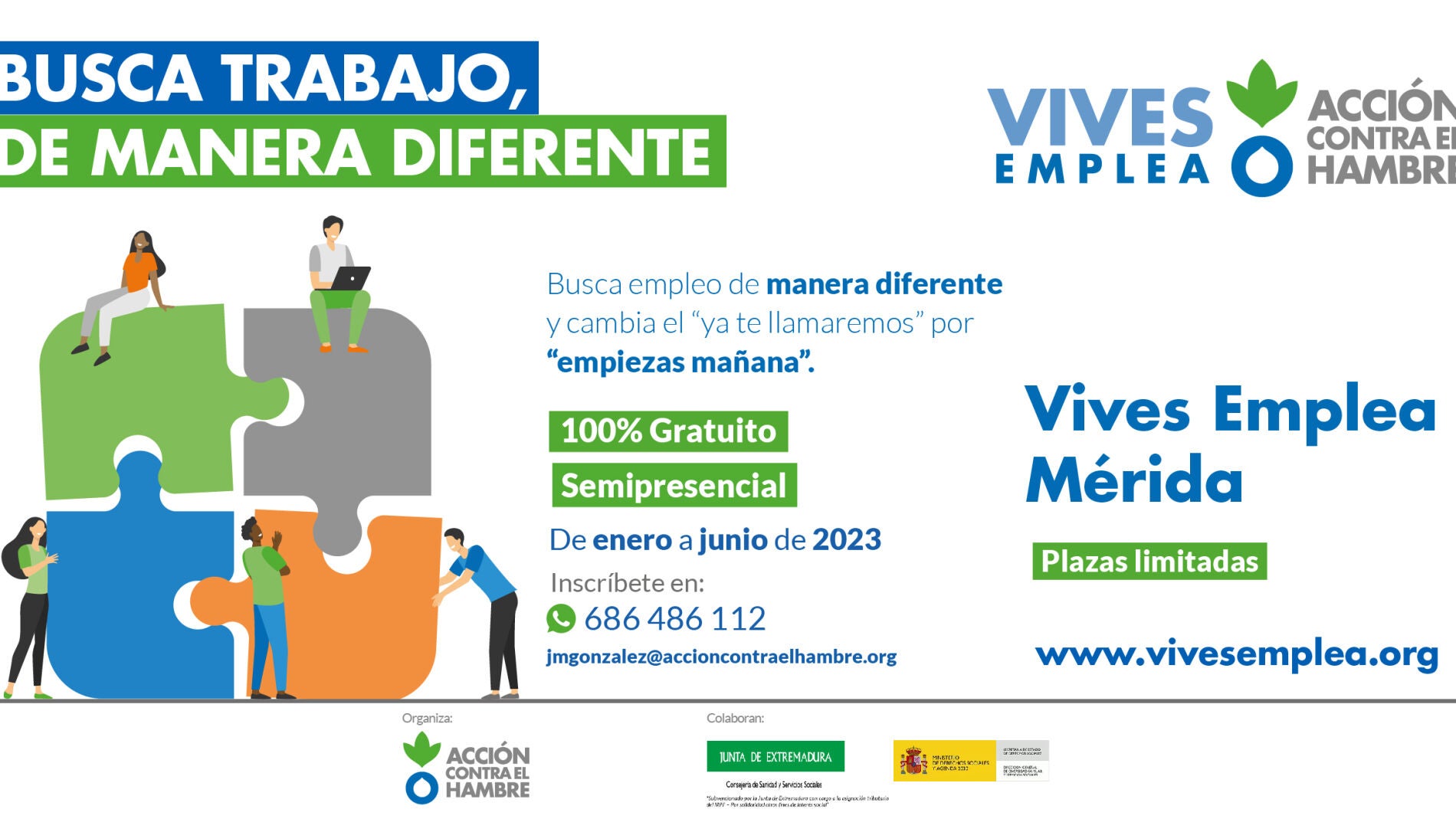 La Fundación Acción contra el Hambre desarrolla en Mérida el programa Vives Emplea. Con él se quiere atender y acompañar a las personas que buscan empleo. El proyecto acaba de arrancar y ayudará a 25 personas desde enero hasta junio. En estos momentos se encuentran en fase de selección de personas. Quien desee obtener más información puede ponerse en contacto a través del correo jmgonzalez@accioncontraelhrambre.org