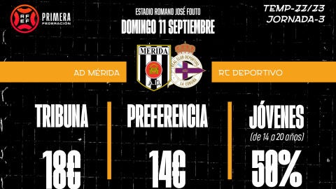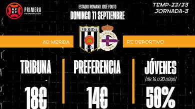 La Asociación Deportiva Mérida SAD enviará un paquete de 400 entradas al RC Deportivo de la Coruña al precio de 15 euros.