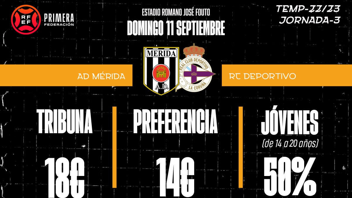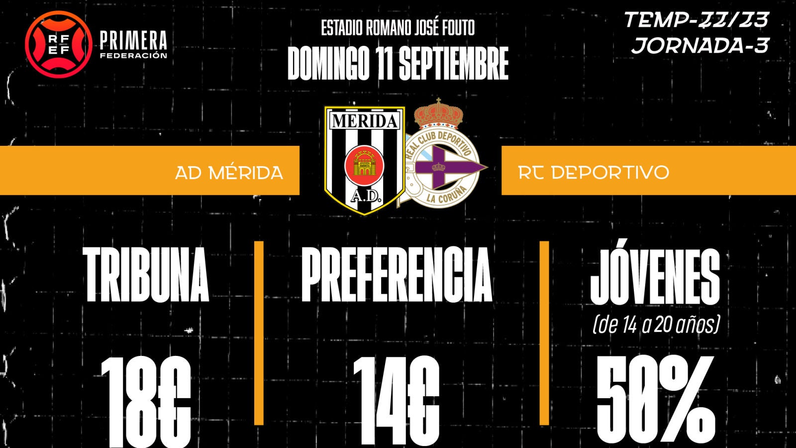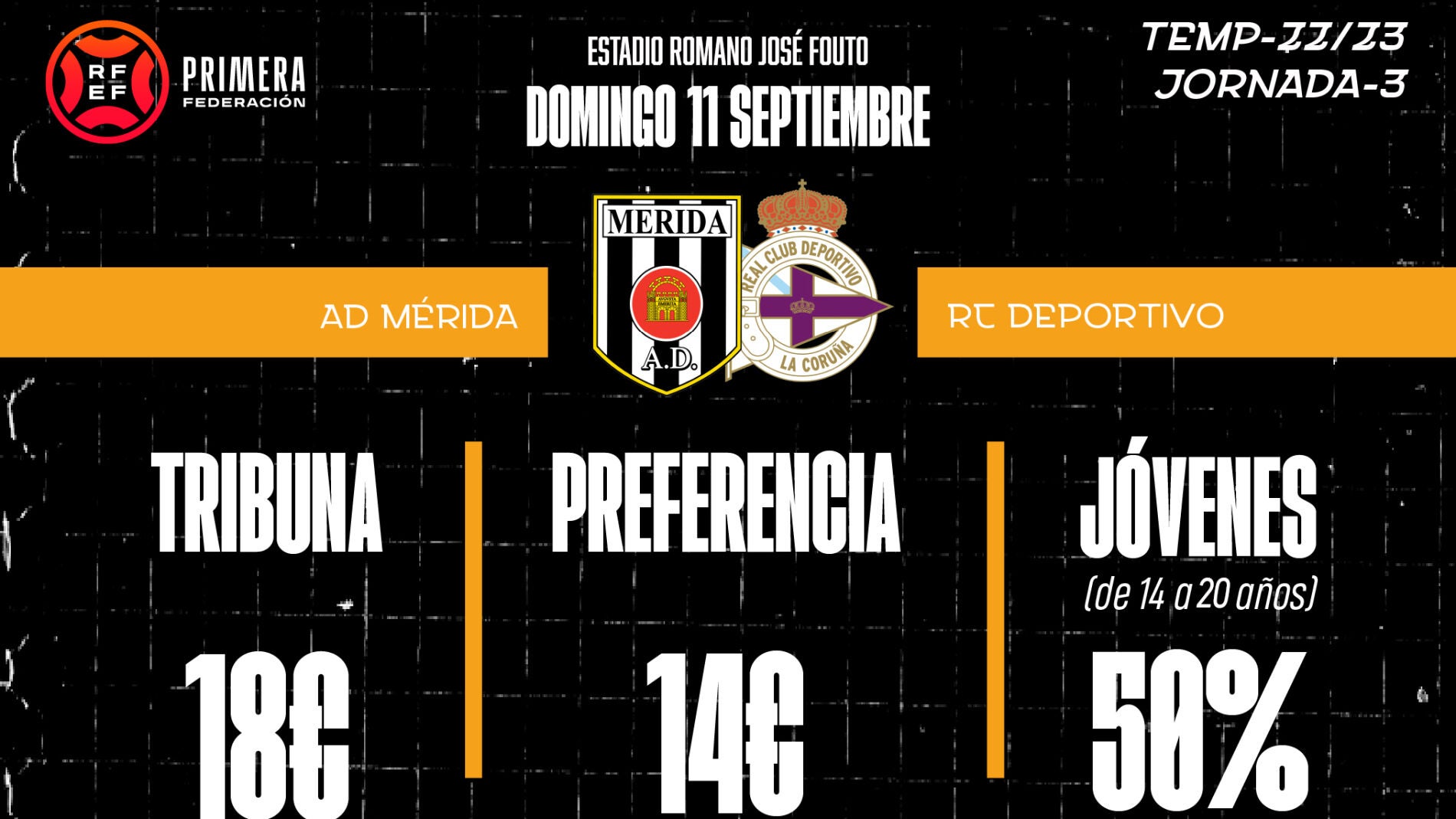 La Asociación Deportiva Mérida SAD se enfrenta este domingo a las 12:00 horas en el Estadio Romano José Fouto ante el RC Deportivo de la Coruña en lo que será la jornada 3 del Grupo I de Primera Federación.