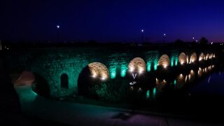 Varios monumentos de Mérida como la muralla de la Alcazaba y el Puente Romano, así como la fuente de la Plaza de España y la fachada del ayuntamiento se iluminan este miércoles, 26 de abril, en colores verde y naranja por el Día Nacional de la Fibrosis Quística.