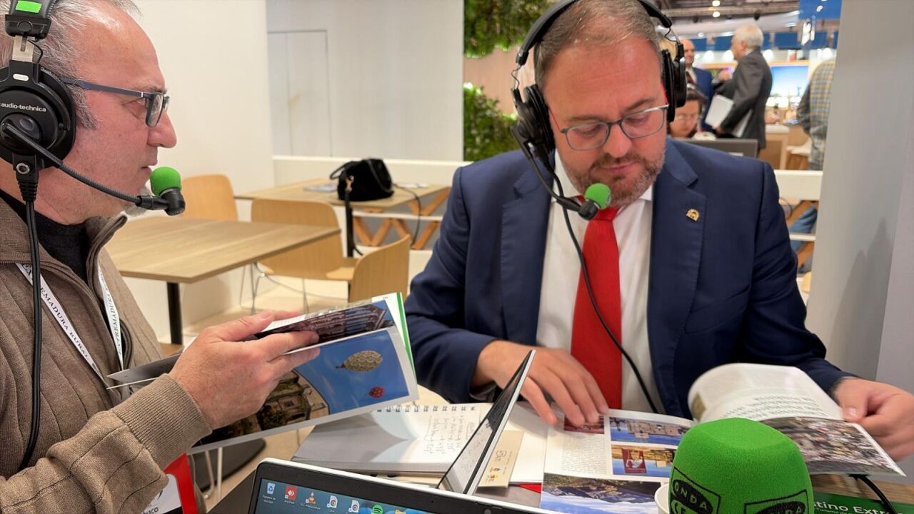El alcalde de Mérida, Antonio Rodríguez Osuna, en los micros del stand de Onda Cero Extremadura en FITUR