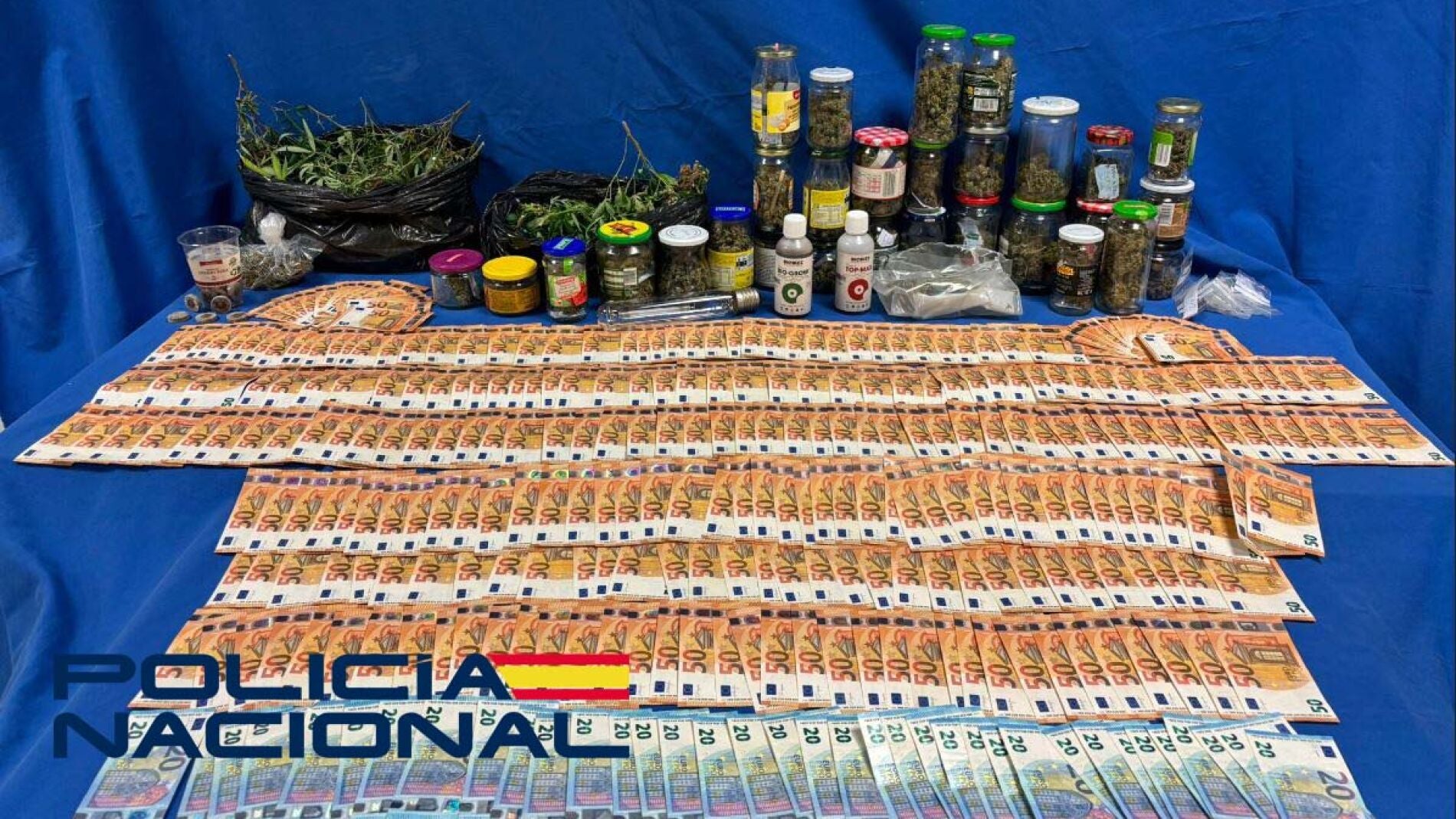 En la vivienda se intervinieron 22 plantas de marihuana, 29 botes de cristal con unos 2 kilos de cogollos de esta sustancia, 18.750 euros en efectivo y diversos útiles relacionados con los cultivos de esta planta.