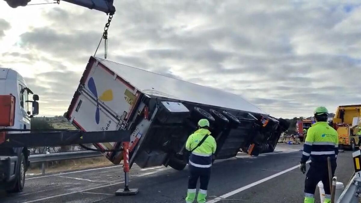 Una mujer de 58 años herida grave tras el vuelco de un camión articulado en la A5 cerca de Trujillo