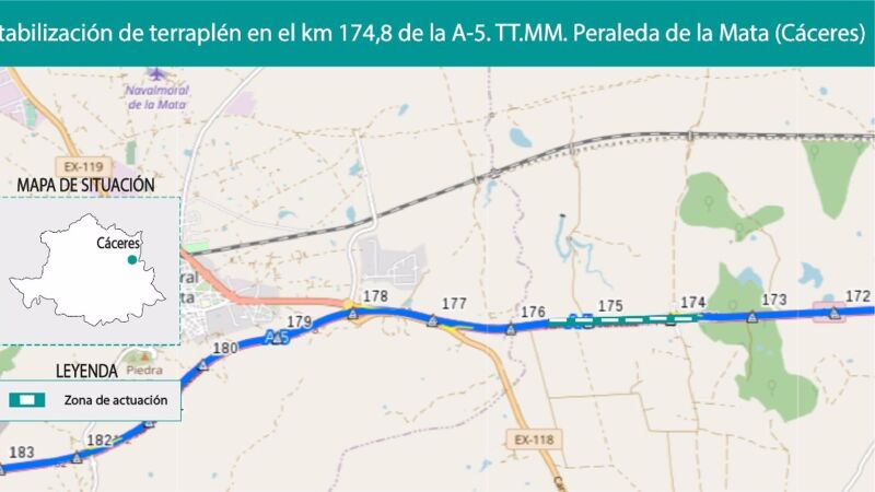 El Ministerio de Transportes, Movilidad y Agenda Urbana (Mitma) ha adjudicado por importe de 333.000 euros (IVA incluido), un contrato para la estabilización del terraplén situado en el kilómetro 174,8 de la calzada derecha sentido Badajoz de la autovía A-5, en el término municipal de Peraleda de la Mata, en la provincia de Cáceres.