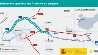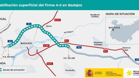 El Ministerio de Transportes y Movilidad Sostenible está ejecutando las obras de rehabilitación superficial y puntualmente estructural del firme de la autovía A‐5, entre los km 392,300 al 407,821, en el tramo Badajoz Este ‐Badajoz Oeste. El importe de la adjudicación de estas obras asciende a 14.275.901euros (IVA incluido).