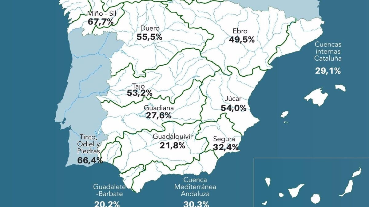 En el conjunto del país, la reserva hídrica española ha perdido esta semana 714 hectómetros cúbicos, el 1,3 por ciento de su capacidad total, por lo que en estos momentos los embalses están al 43,4 por ciento y guardan 24.329 hectómetros cúbicos de agua.