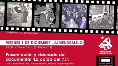 El documental 'La caída del 73', que aborda la "detención" y "tortura" de 160 militantes extremeños del Partido Comunista (PCE) en la región en 1973 se presenta el próximo viernes, día 1 de diciembre, en el Centro Cívico de Almendralejo, a las 18,00 horas.
