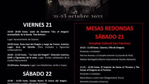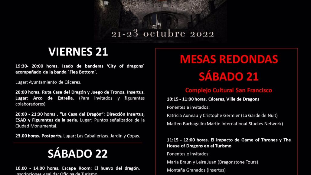 En la misma situación se encuentran las mesas redondas 'Cáceres, Ville de Dragons' y 'El impacto de Game of Thrones y The House of Dragons en el Turismo', que pasarán al complejo San Francisco, en lugar de celebrarse en El Foro de los Balbos donde estaban programadas, y también 'el desfile y concurso de cosplay escolar', de 18,30 a 19,30 horas, en el complejo San Francisco.