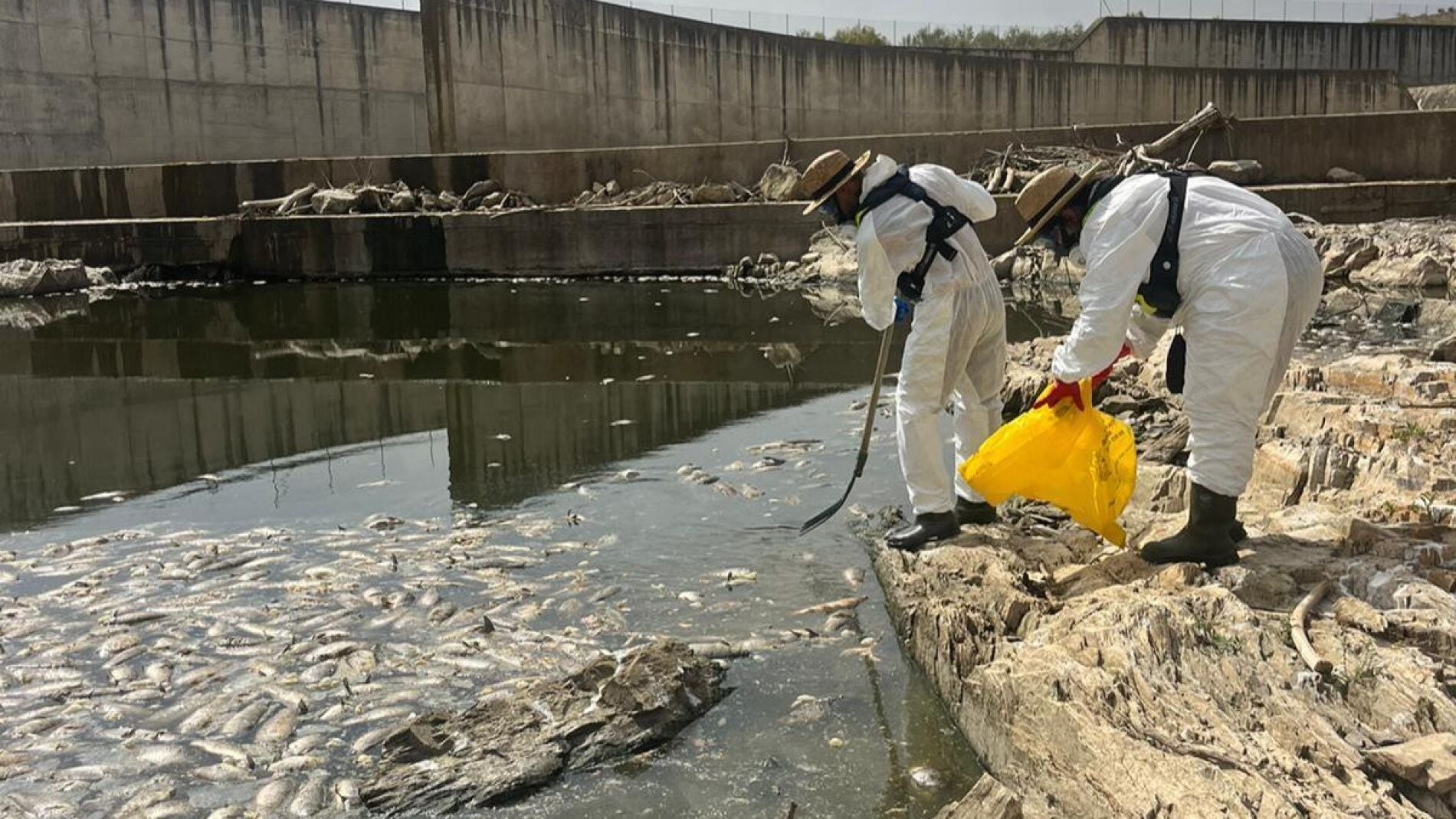 Los trabajos de retirada de los ejemplares muertos, concretamente de carpas y carpines, se iniciaron este lunes con la participación de hasta dieciséis operarios –número que se irá ajustando según necesidades– y continuarán durante toda la semana hasta conseguir la total limpieza del embalse.