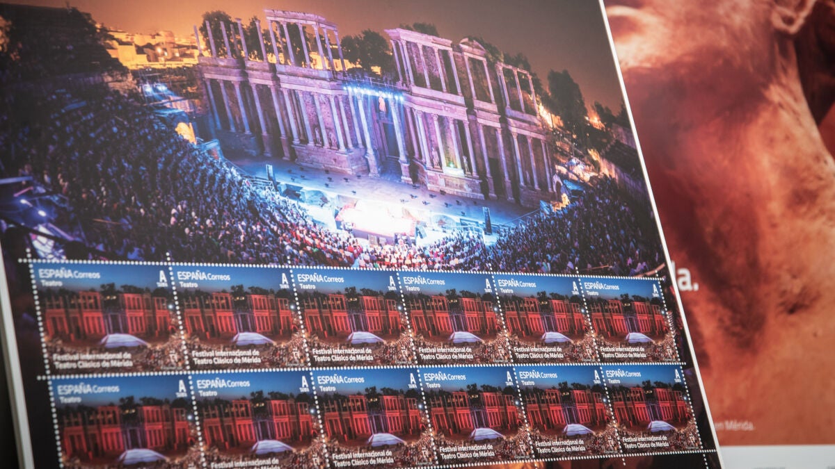 La compañía Correos ha emitido un sello por el 90 aniversario del Festival Internacional de Teatro Clásico de Mérida ilustrado con una imagen del Teatro Romano de noche con sus gradas llenas.