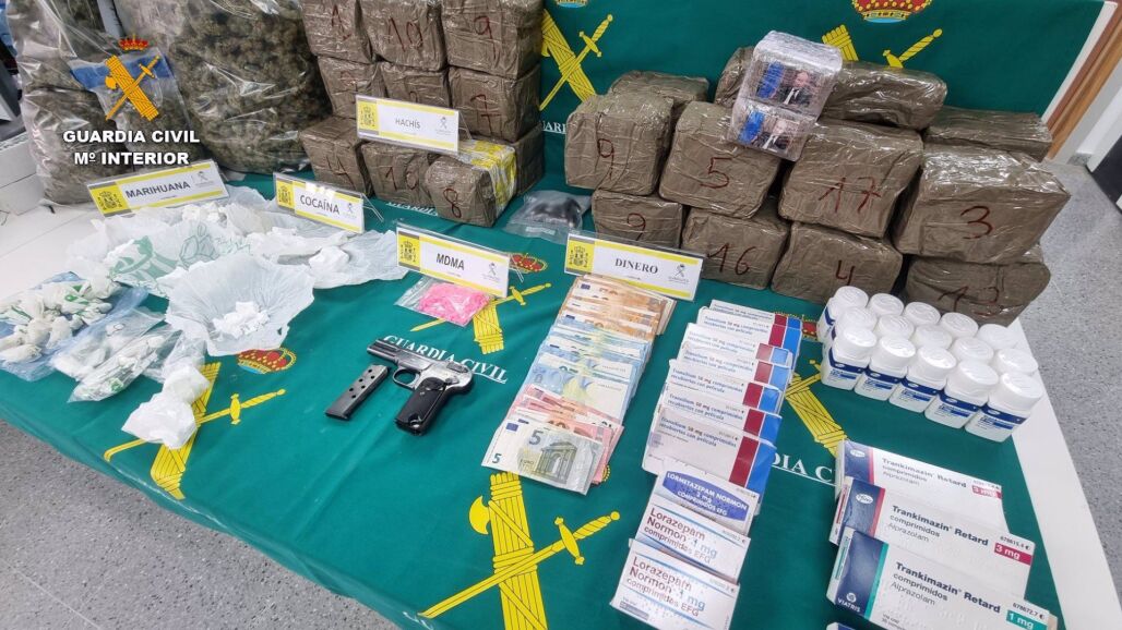 Se han aprehendido más de 30 kilogramos de hachís en distintos formatos (tabletas y bellotas), 2.124 dosis de cocaína de gran pureza, 154 pastillas de MDMA (éxtasis), cerca de 3.000 gramos de marihuana, una pistola semiautomática, que se encontraba cargada y lista para su uso, 184 cartuchos de munición, una báscula de precisión, teléfonos móviles y 2.365 euros.