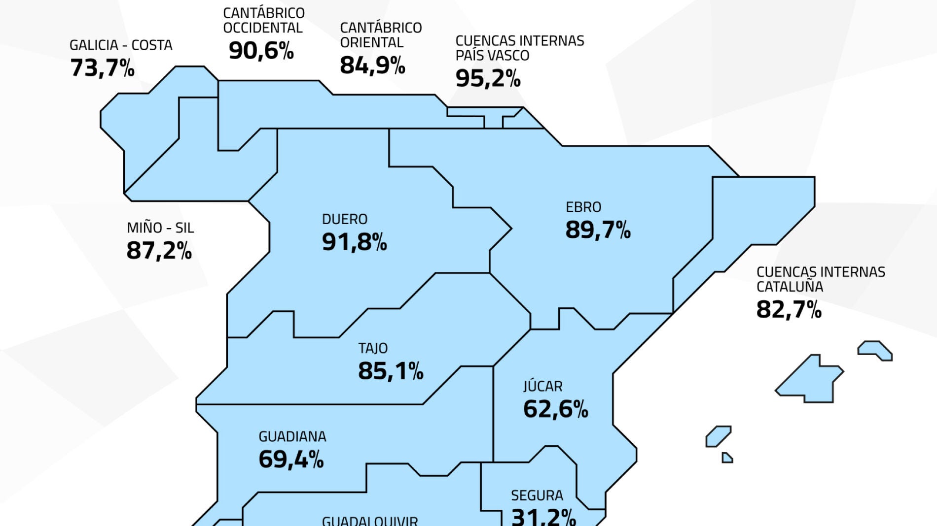 La reserva hídrica de los embalses de las cuencas del Tajo y Guadiana han registrado un descenso en los últimos siete días del 0,5 %, y presentan porcentajes del 85,1 % y del 69,4 %, respectivamente.