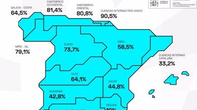 En el conjunto del país, la reserva hídrica almacena actualmente 30.125 hectómetros cúbicos (hm3) y se encuentra al 53,8 por ciento, lo que representa 1,7 puntos menos que la semana pasada, según datos del Ministerio para la Transición Ecológica y el Reto Demográfico (MITECO).