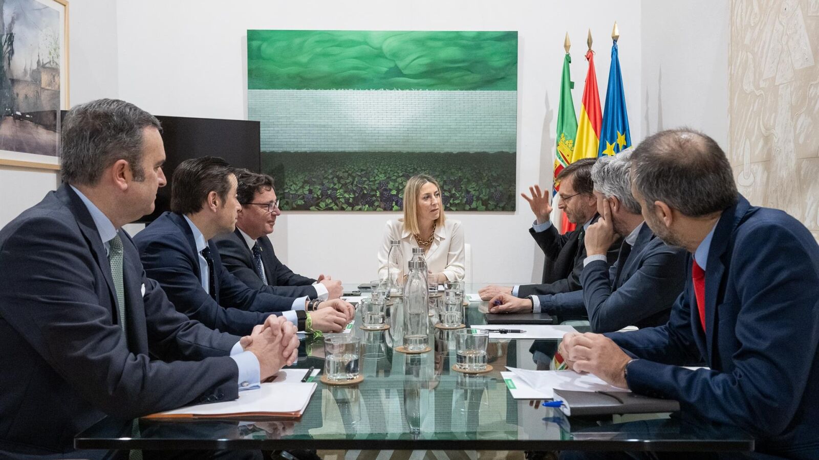 La presidenta de la Junta de Extremadura en funciones, María Guardiola, se ha reunido este viernes con los responsables de FRV, empresa especializada en el desarrollo de soluciones energéticas sostenibles, y parte de Jameel Energy, con motivo de la puesta en marcha del proyecto 'Lusitanus', que se ubicará en el parque empresarial ExpacioMérida.