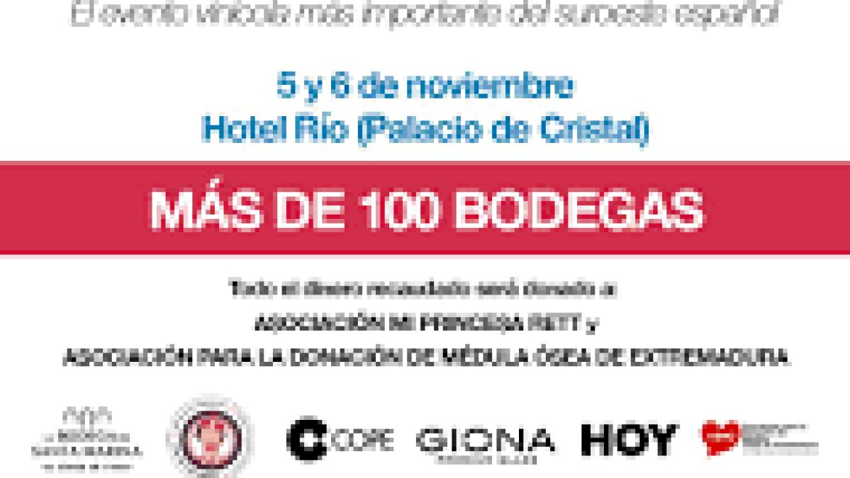 El evento solidario 'Badajoz Wine Experience' recaudará fondos los días 5 y 6 de noviembre en el Palacio de Cristal del Hotel Río de Badajoz con el fin de recaudar fondos para la Asociación Princesa Rett y Asociación para la Donación de Médula Ósea de Extremadura, que colabora en su organización.