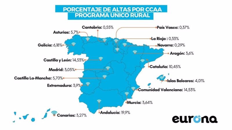 Extremadura contabiliza el 3,9% de las altas en el programa Único rural, que persigue garantizar la conectividad de banda ancha --al menos 100 Mbps-- a un precio asequible de 35 euros al mes para cerrar la brecha digital en las zonas rurales, según datos de Eurona.