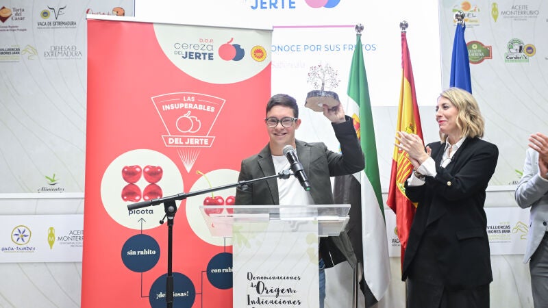 La presidenta en funciones de la Junta de Extremadura, María Guardiola, ha hecho entrega del Premio a la Excelencia Picota del Jerte 2026 junto al presidente del Consejo Regulador de la DOP Cereza del Jerte, José Antonio Tierno, en un acto celebrado durante el Salón Gourmets, que tiene lugar en IFEMA del 13 al 16 de abril en Madrid.