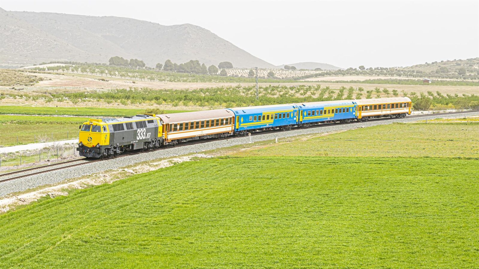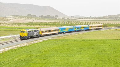 Entre su colección se encuentra este 'Tren de los 80', que participa en el viaje por tierras extremeñas. Se trata de una composición formada por varios coches de viajeros construidos en la década de 1980 y que incluyen coches salón, coches de departamentos, coches literas o un coche-camas, todos ellos pintados en colores azul y amarillo o marrón y crema.
