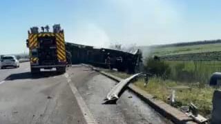 Un hombre de 24 años herido con quemaduras de segundo grado tras volcar su camión en la A5 a la altura de Badajoz