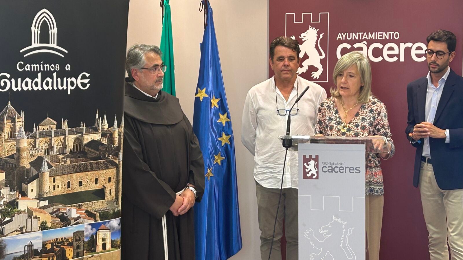El acto ha tenido lugar en el Ayuntamiento de Cáceres y ha contado con la intervención del concejal de Turismo, Ángel Orgaz; el presidente de la Asociación Red de Cooperación de los Caminos a Guadalupe, José Miguel Martín; y Fray Vidal, recientemente nombrado Guardián del Real Monasterio de Guadalupe. También ha estado presente Felipe Sánchez, gerente de la asociación, y el director general de Turismo, Óscar Mateos.