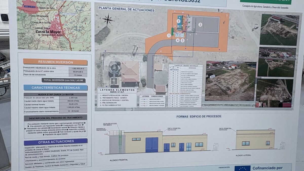 La Junta de Extremadura ha comunicado al Ayuntamiento de Zarza la Mayor la finalización de las obras de la nueva estación de tratamiento del agua potable (ETAP) de la localidad que va a sustituir íntegramente a la actual planta debido a la obsolescencia de la mayoría de las instalaciones que la conforman, lo que dificulta la adecuada potabilización del agua bruta que llega desde el embalse de la localidad.