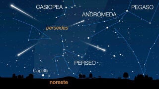 El punto radiante de las Perseidas, de donde parecen originarse los meteoros, está cerca de la estrella Mirfak (a Persei), en la constelación de Perseo.