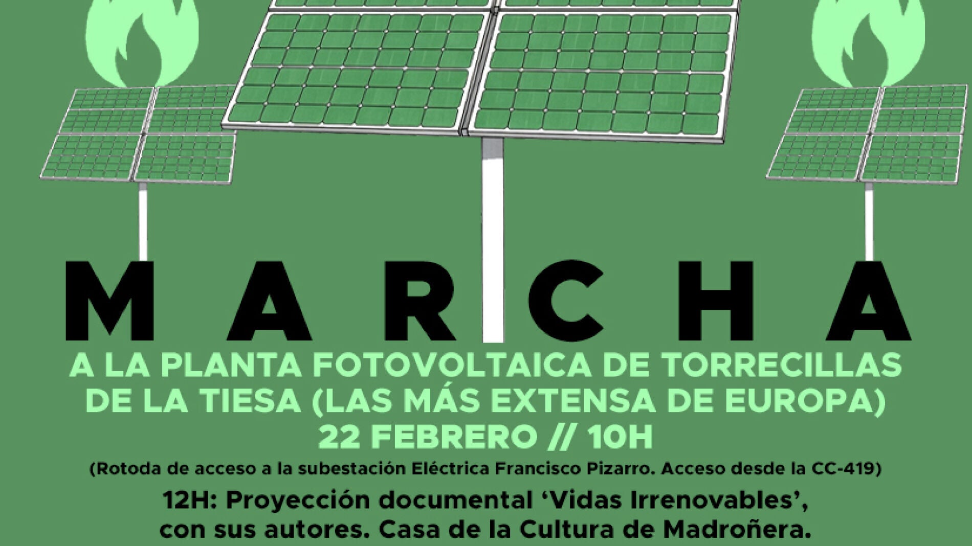 Este domingo 22 de febrero se celebrará una marcha-protesta “contra el alicatado fotovoltaico de Extremadura, que no es más que el saqueo y expolio de nuestra región por parte de grandes eléctricas como Iberdrola, Endesa y otras multinacionales foráneas”.