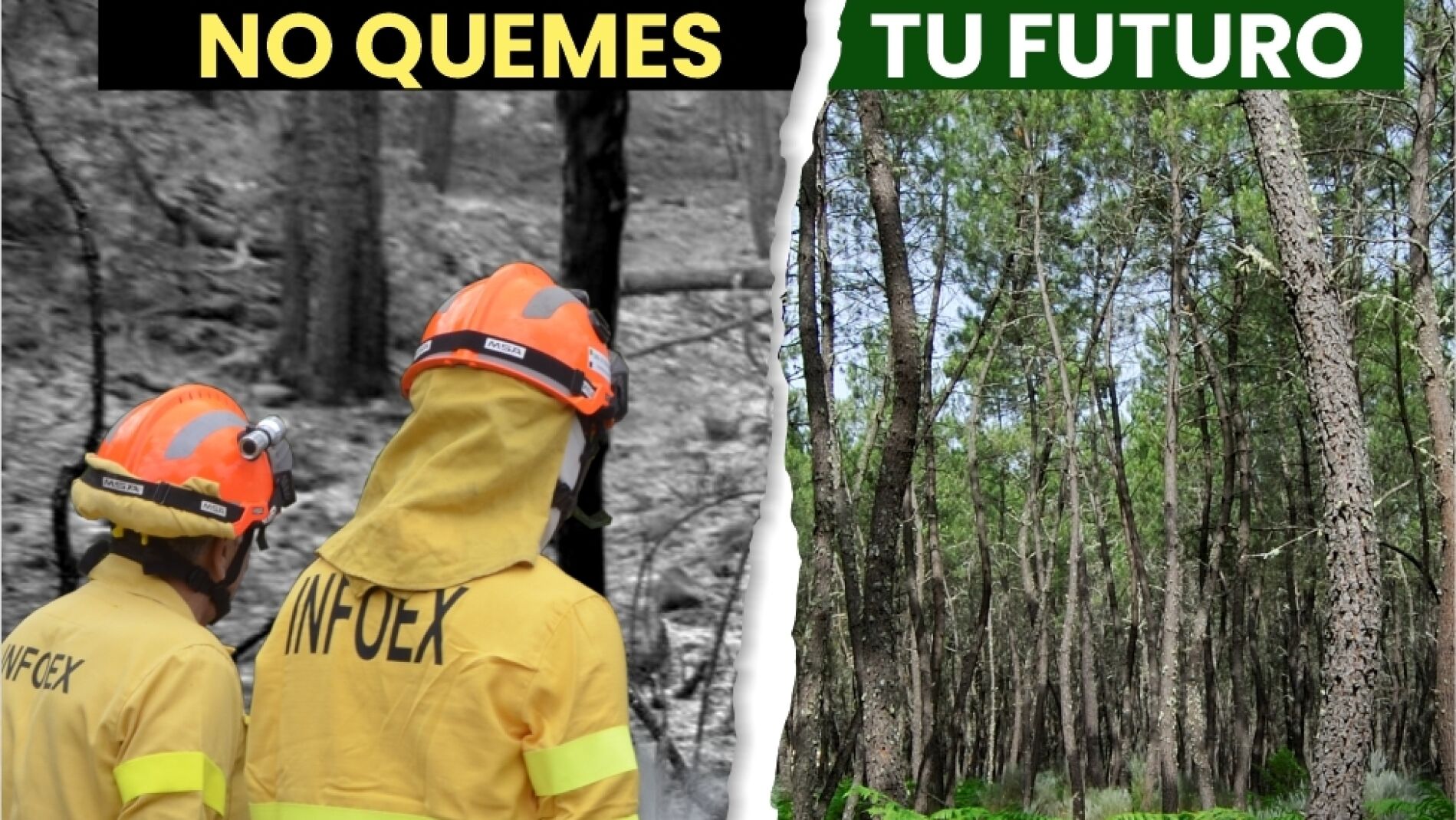 Tomando como referencia el soporte principal del cartel, la campaña muestra una contraposición entre un pinar verde y un paisaje quemado. En una de las imágenes, se muestra un paisaje desolador en el que dos bomberos forestales trabajan en la extinción de los últimos rescoldos que han dejado las llamas, y en la otra una frondosa estampa de pinos y helechos verdes.