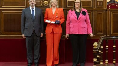 La presidenta de la Asamblea de Extremadura, Blanca Martín, ha recibido este lunes, 8 de abril, la Medalla de Honor, conocida como Cruz de la Dignidad, de la Asociación de Víctimas del Terrorismo (AVT) en el Senado, donde ha agradecido el reconocimiento y ha señalado que es "un honor" recoger la distinción en la Cámara Alta.