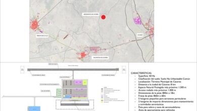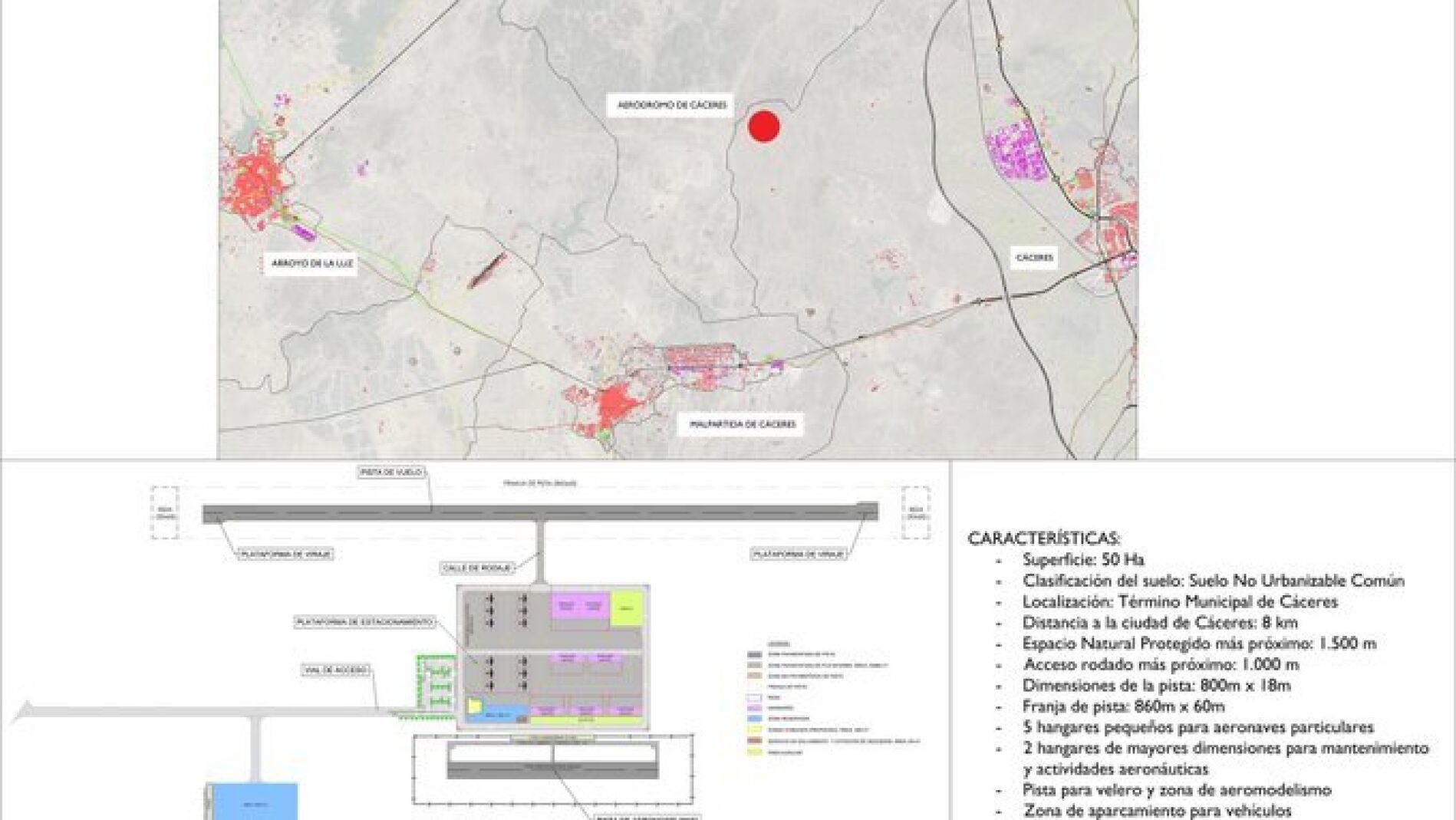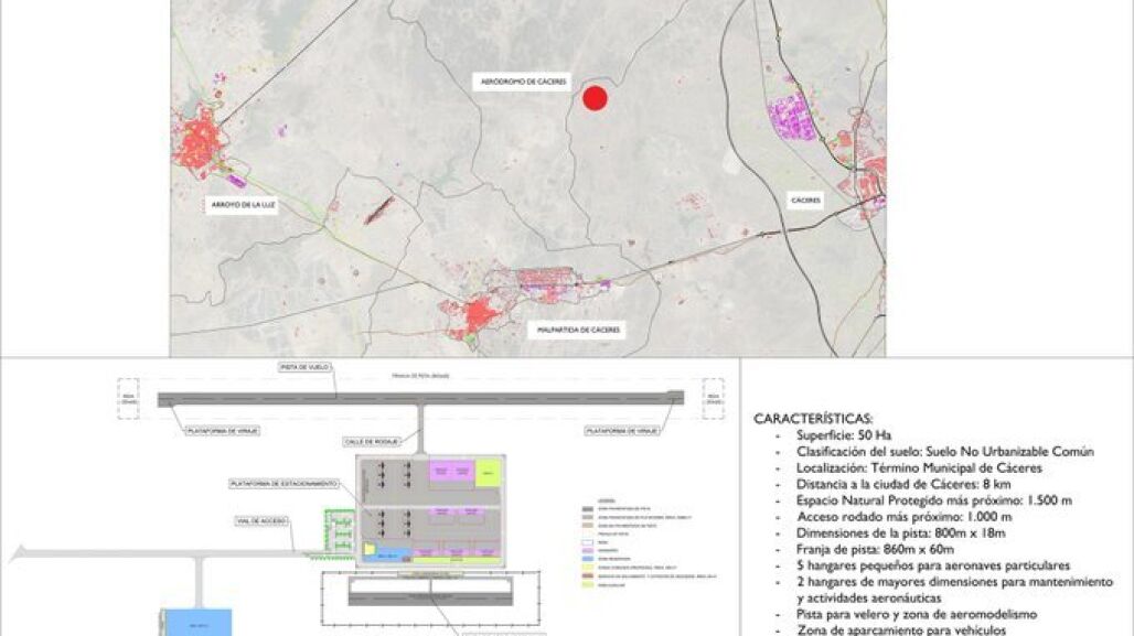 La actuación consiste en el diseño de un aeródromo de uso restringido en el entorno de la ciudad de Cáceres, emplazado al Oeste de esta; en las parcelas 16, 17, 18 y 19 del polígono 19 del término municipal, a una distancia aproximada por carretera de 8 kilómetros hasta el núcleo urbano.