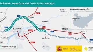 El Ministerio de Transportes y Movilidad Sostenible continúa ejecutando las obras de rehabilitación superficial y puntualmente estructural del firme de la autovía del Suroeste A-5, entre los kilómetros 392,300 al 407,821, en el tramo Badajoz Este -Badajoz Oeste, en la provincia de Badajoz. El presupuesto vigente de las obras es de 14,276 millones de euros (IVA incluido).