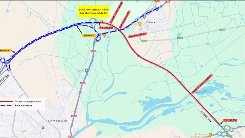 El corte total de la calzada será en sentido Portugal entre los kilómetros 395,250 y 399,850, mientras que la salida 400 hacia la N-523 Cáceres estará cortada, por lo que se habilitará una ruta alternativa, y la incorporación desde la N-523 hacia la A-5 en sentido Portugal seguirá funcionando con normalidad, según informa el ministerio en nota de prensa.