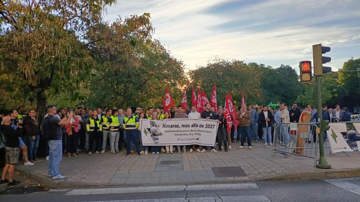 Unos 200 trabajadores de la Central Nuclear de Almaraz (CNA) se han concentrado este miércoles en Cáceres a las puertas del Palacio de Congresos para pedir que no se cierre la planta cacereña y parar la "cuenta atrás" de este proceso que, según está planteado, llevaría a cabo el apagón de un reactor en 2027 y del segundo en 2028.