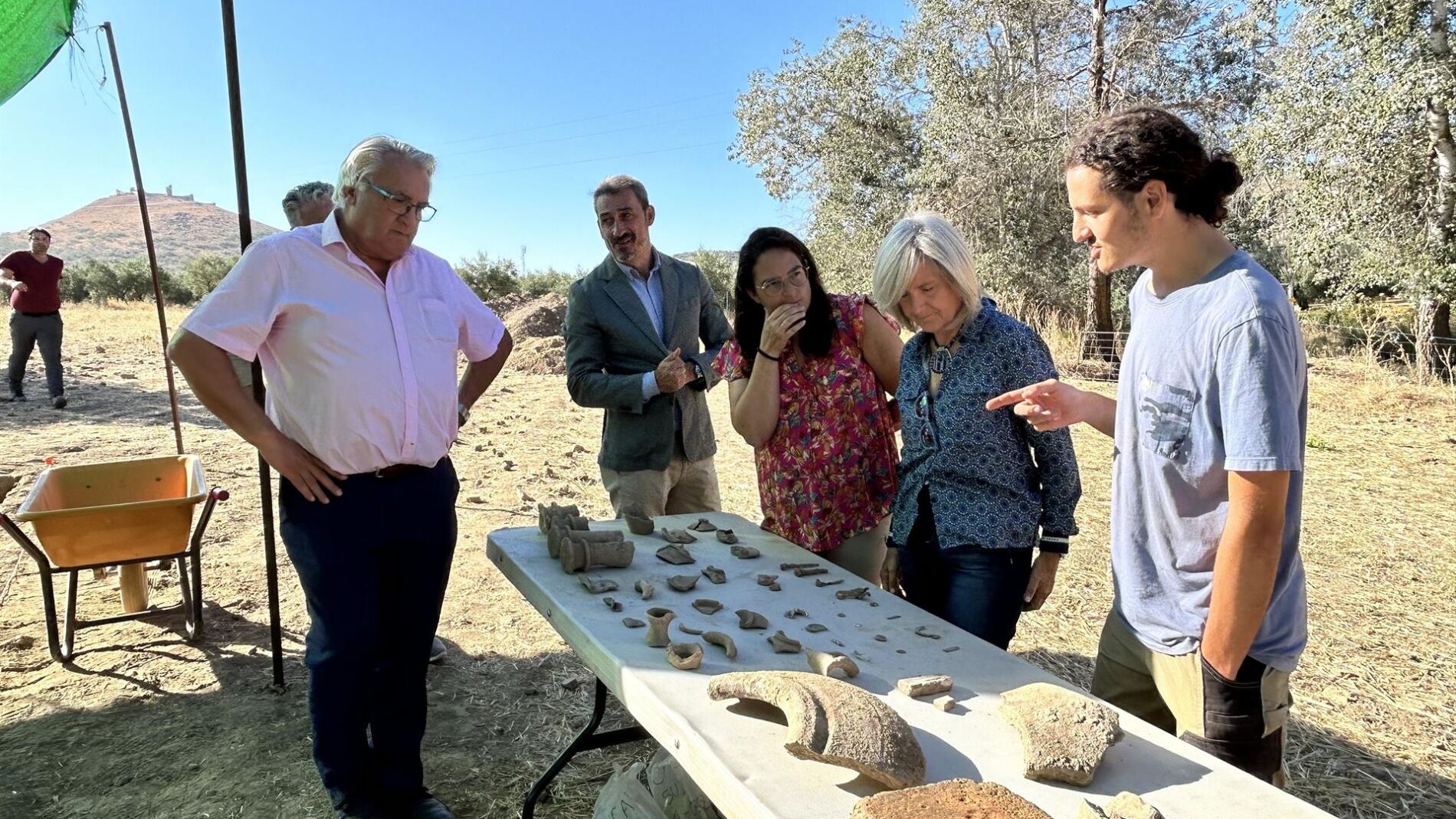 La visita se ha realizado en el marco de la cuarta campaña de excavaciones y prospecciones de una treintena de arqueólogos que, durante tres semanas, se desplazan a Casas de Reina para avanzar en la investigación sobre lo que fue la antigua ciudad romana de Regina, explica en nota de prensa la Junta de Extremadura.