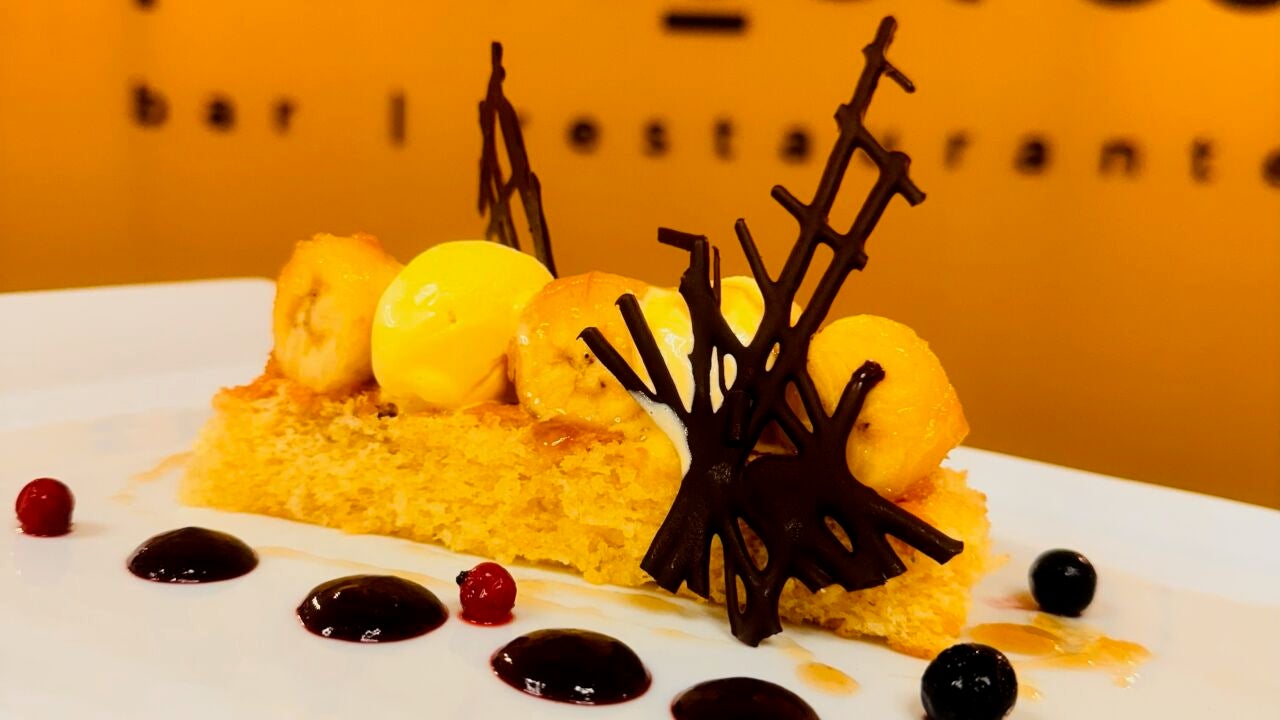 · Como ya tenemos todos los ingredientes, lo que hacemos ahora es emborrachar con el jarabe el bizcocho, lo colocamos en el centro del plato y sobre el bizcocho colocaremos Los trozos de plátano pondremos también el helado sobre el plátano, salseamos con el glaseado ponemos unos puntitos de La compota de frutos rojos unos arándanos y el crujiente de chocolate.