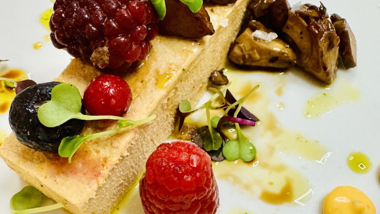 · Solamente nos quedaría servir en el plato, vamos a desmoldar nuestro turrón blando de atún, lo cortamos de forma rectangular, ponemos sobre el plato, lo acompañamos en un extremo de los gurumelos, los frutos rojos, con unos puntitos de pesto, unas gotitas de aceite de oliva, sal en escamas y unos brotes.
