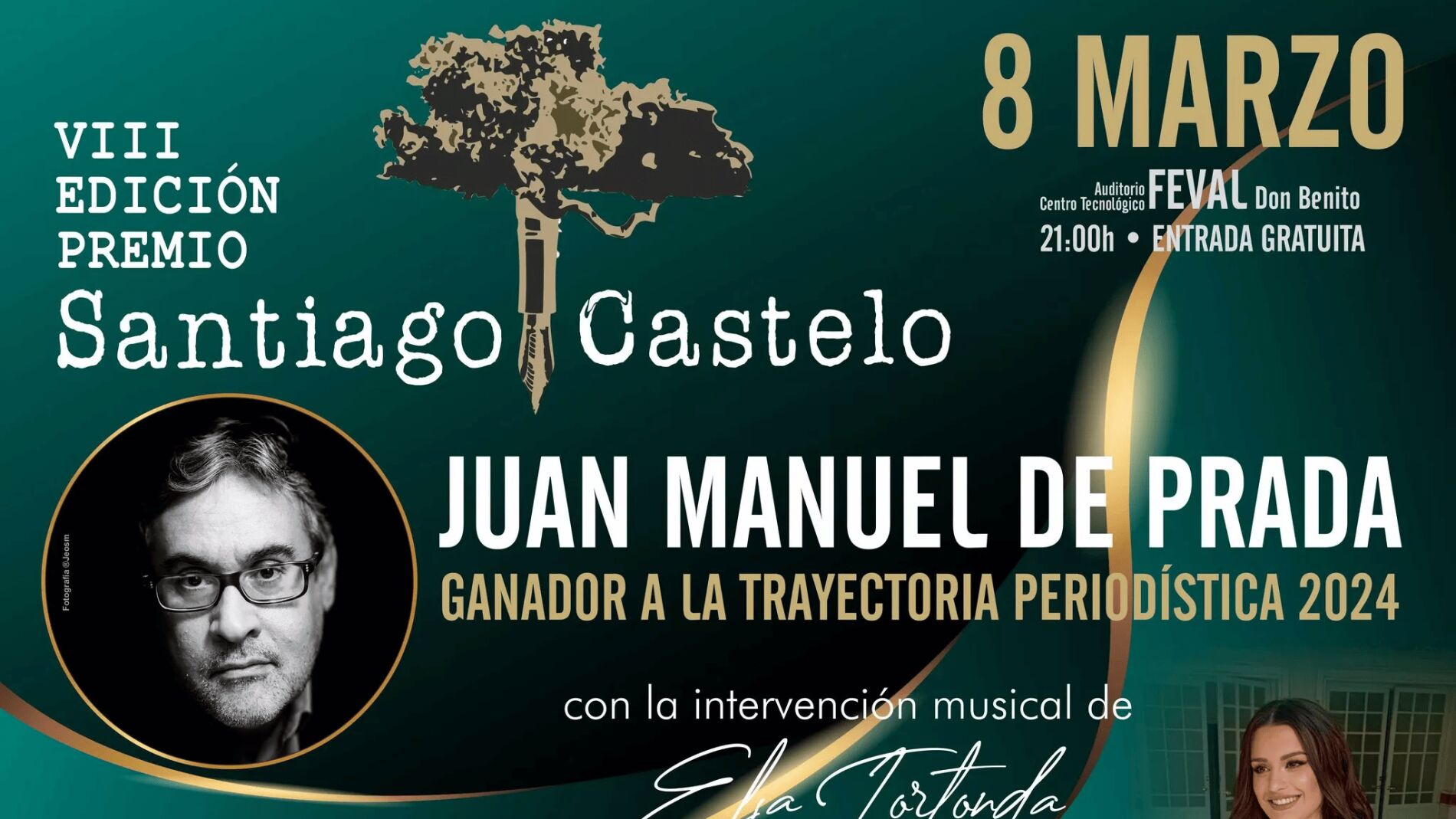 Don Benito recibe al escritor Juan Manuel de Prada para entregarle el VIII Premio Santiago Castelo que reconoce la trayectoria periodística, en una gala celebrada en el Auditorio del Centro Tecnológico Feval a partir de las 21:00 horas y amenizada por la ganadora de la última edición del programa "La Voz", Elsa Tortonda.