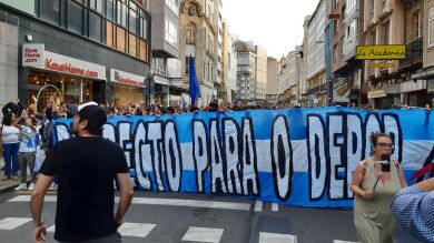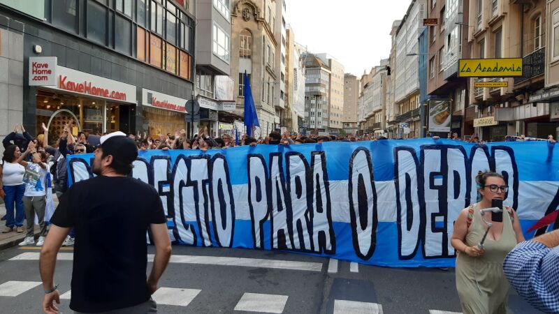Vivimos el día siguiente a la manifestación del deportivismo a las puertas de ABANCA, pidiendo a la propietaria del Deportivo respeto, transpariencia e incluso una asamblea de accionistas presencial. La Policía Local de A Coruña apuntó a Onda Cero que unas 1800 personas participaron en la manifestación que discurrió con total normalidad desde la Pza. de Pontevedra, delante de la sede del Dépor, pasando por San Andrés y acabando en esa misma calle, a las puertas de ABANCA, que eso sí, estaba acordonada por numerosos efectivos de la Policía Nacional, que llegaron en tres furgonetas a la zona. Y con la atenta mirada de la seguridad privada de ABANCA.