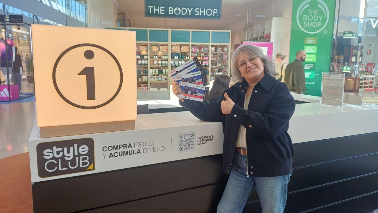 María Ferrer, de Coruña The Style Outlets, con las invitaciones para el concierto de Despistaos que regalan en el punto de información