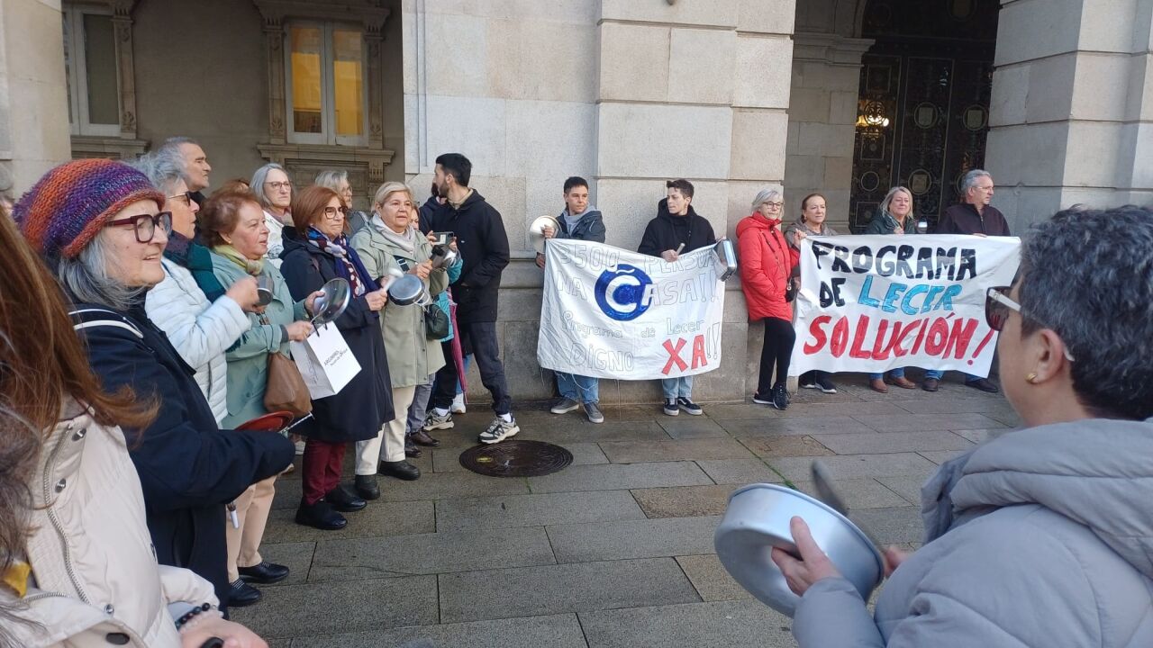 Algo más de cien personas, entre educadores y usuarios del programa Lecer, protestaron con una cacerolada a las puertas del Concello de A Coruña, coincidiendo además con el Pleno Municipal. Beatriz Álvarez, educadora y portavoz era contundente a la hora de valorar la falta de soluciones reales a día de hoy con el programa en el que participan unos 3500 usuarios está paralizado y trabajadores sin cobrar. Antes de entrar en el Concello, el Concejal de Cultura, Gonzalo Castro, se dirigió a los manifestantes, apuntando que el Concello está con los trámites para cancelar la actual concesión a Serviplus y que el Lecer pase a ser asumido por otra, algo que después corroboraba en su turno de palabra en el Pleno. También se refirió a esta situación la concejala del Bloque Nacionalista Galego, MErcedes Queixas, culpando al gobierno municipal del problema con el programa Lecer.