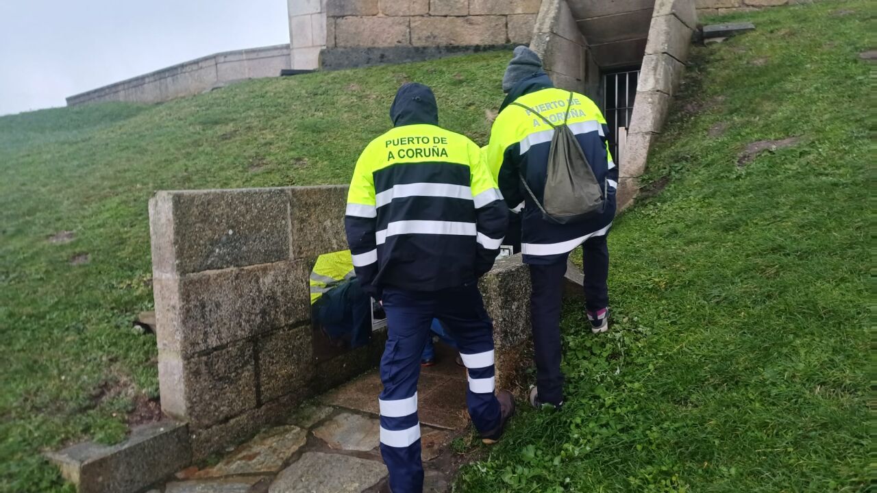 Operarios arreglando el suministro de luz al faro de la Torre de Hércules