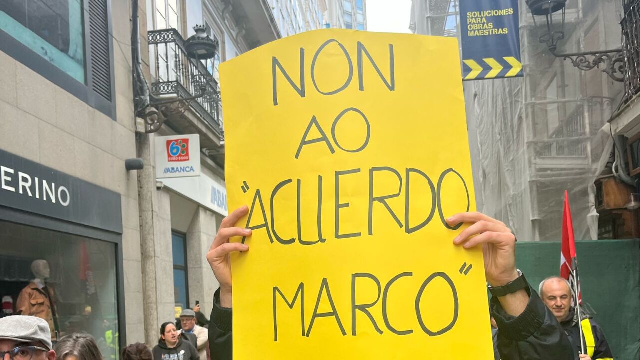 Al grito de "Mans arriba, isto é un contrato", los trabajadores de Correos se concentraron esta mañana en el Obelisco para denunciar el empeoramiento de sus condiciones laborales y exigir la retirada del Acuerdo Marco planteado por la empresa.
